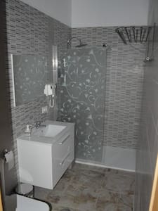 Deze muur is de perfecte balans ten op zichte van de overige sobere kleuren in deze badkamer.