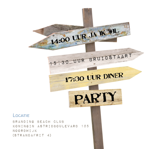 Ook trouwkaart strand is een thema dat wij regelmatig gebruiken in onze ontwerpen. Pas je eigen teksten toe en maak de uitnodiging compleet. Er is een datum geprikt en een locatie uitgekozen dus de uitnodigingen kunnen worden verstuurd. Hieronder geven we jullie ter inspiratie wat voorbeelden van huwelijksuitnodigingen met strand thema.